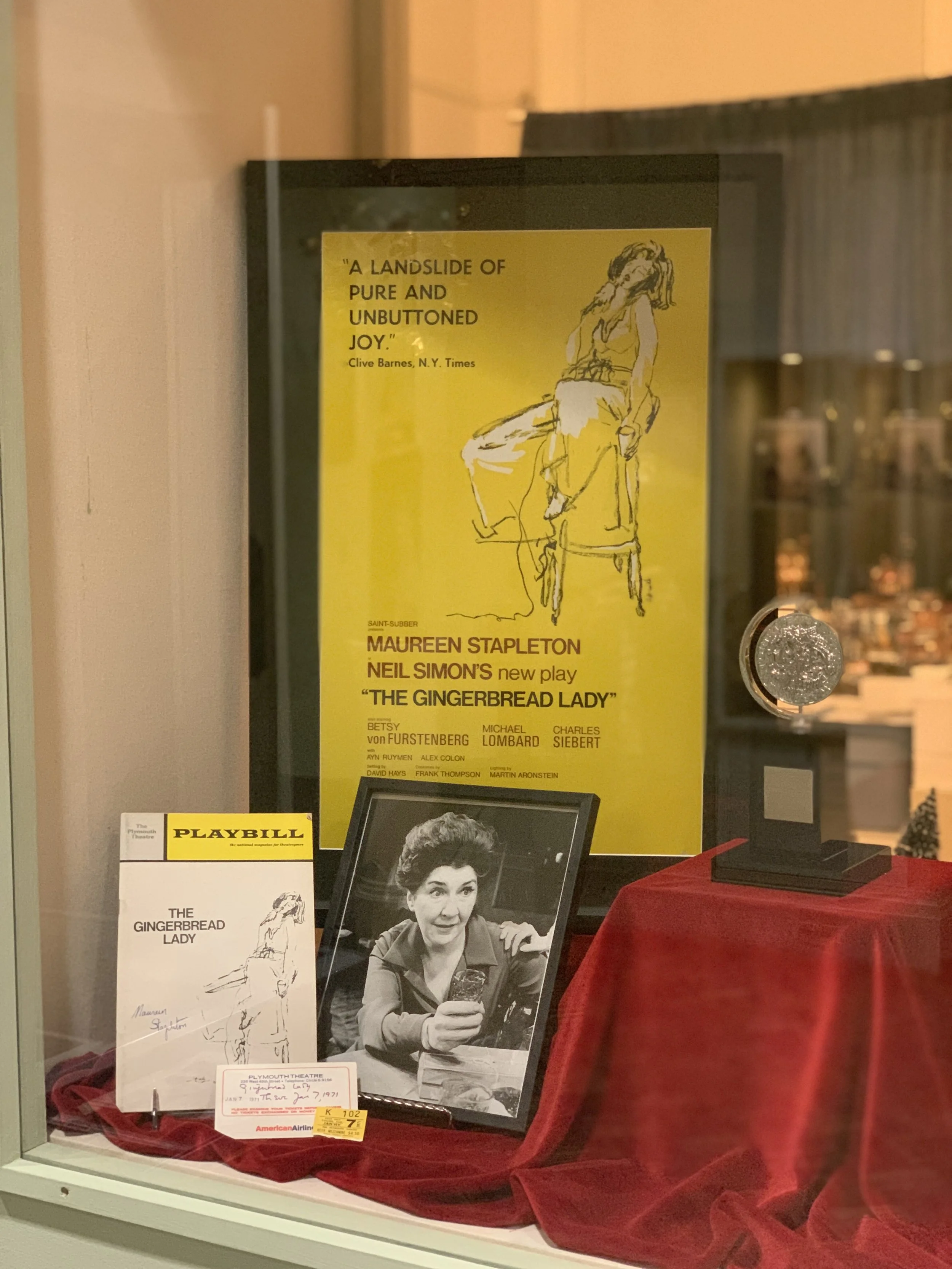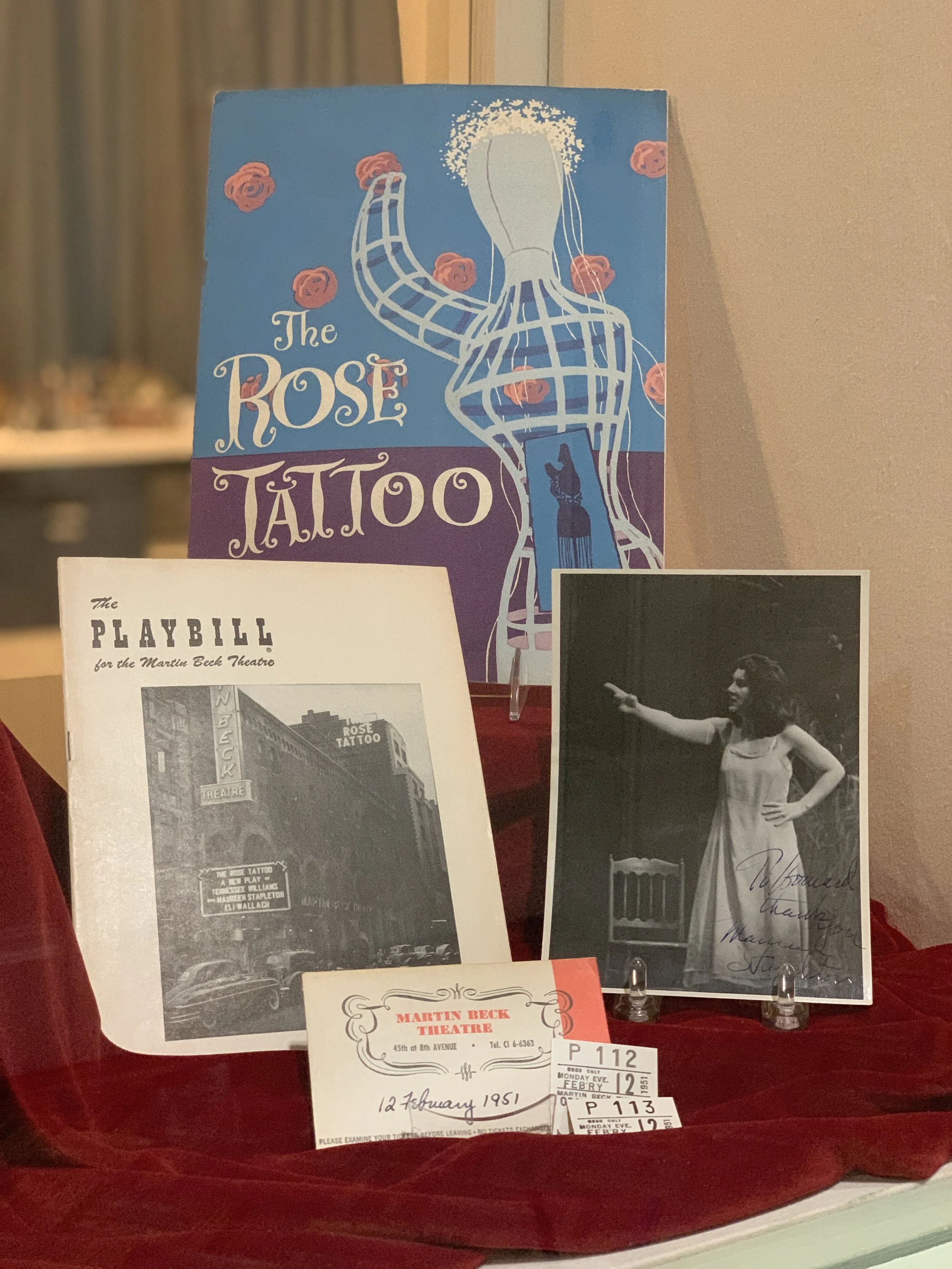The items in this case include the Lobby Card, program, tickets, and photographs for The Gingerbread Lady and The Rose Tattoo. If you look carefully at the playbill cover for The Rose Tattoo you will see Maureen’s name on the marquee!