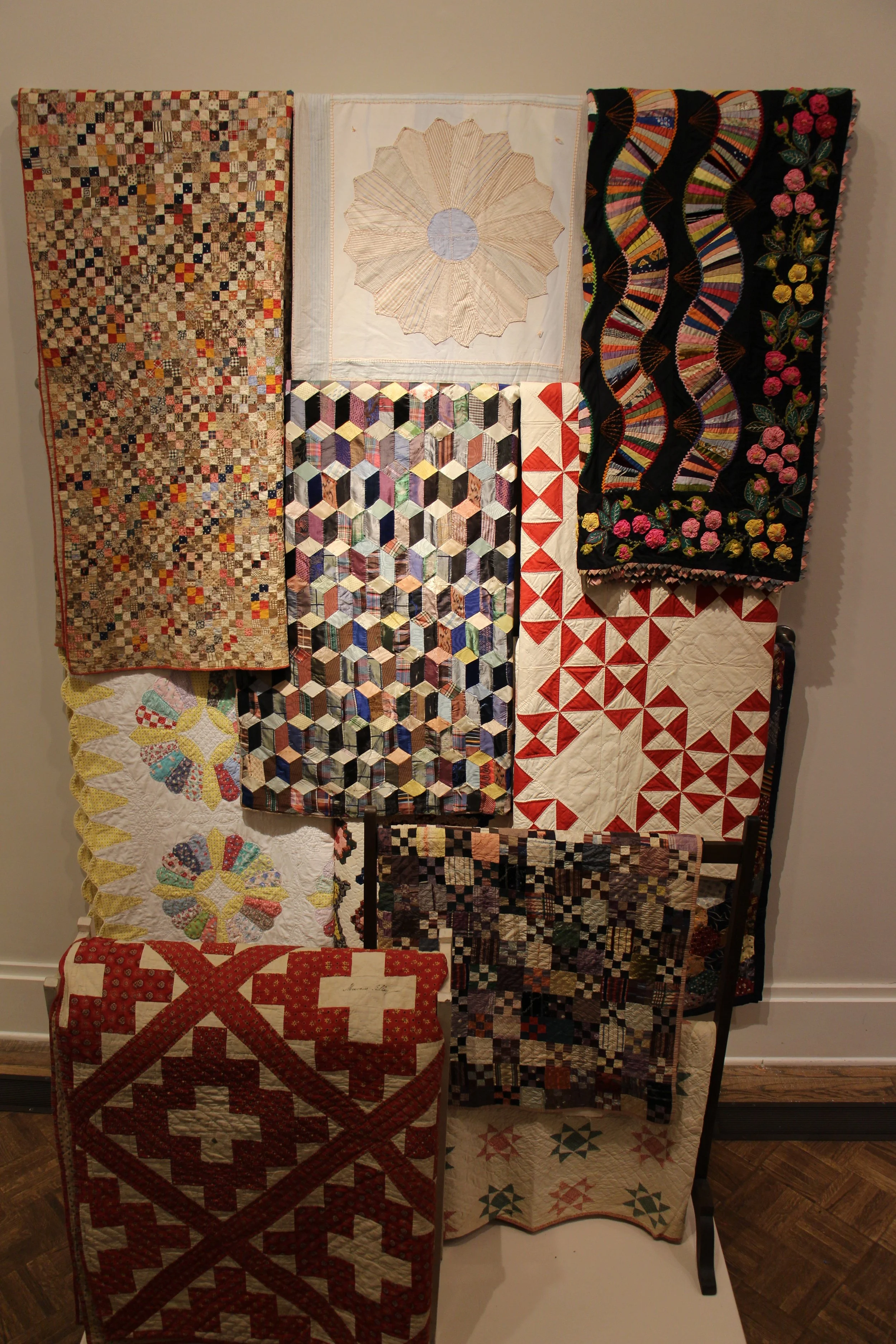 The quilts shown here from the Hart Cluett Museum’s permanent collection are often as valuable as a documentary artifact as they are a utilitarian object. Quilts follow clothing trends in colors and patterns as the fabric for the quilts were taken from bolt ends or scraps of materials that had been used to create a shirtwaist or dress. Quilt designs followed different historic themes from the Log Cabin design in honor of President Abraham Lincoln, to crazy quilts that became popular during the 1876 Centennial Exhibition in Philadelphia. Visitors were entranced by the Japanese Pavilion’s art and design and replicated those designs on quilts. Signature quilts help to identify family or community members, as the red and white signature quilt seen here that was signed by members of the Methodist Church in Grafton, NY. The fact that these quilts have survived is a testament to the meticulous way they were stitched and cared for by multiple generations before being donated to the museum.